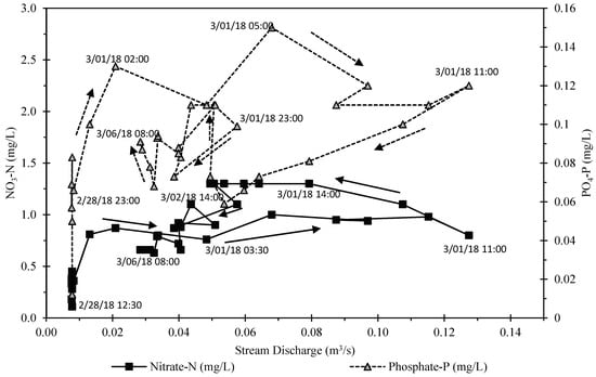 Figure 10 shows the C-Q relationship for the same runoff event as shown in Figure 8. The graph illustrates a complex hysteresis loop and figure-eight pattern, as described by Lloyd at al. (2016) [28]. These complex loops are produced by a change in the form of the relationship between discharge and suspended sediment concentration during the precipitation event. Interestingly, at the end of the event, the concentrations of both NO3-N and PO4-P are higher than their initial concentrations even though the last sample plotted was collected 40 hours after the precipitation event, highlighting the hysteresis process.
