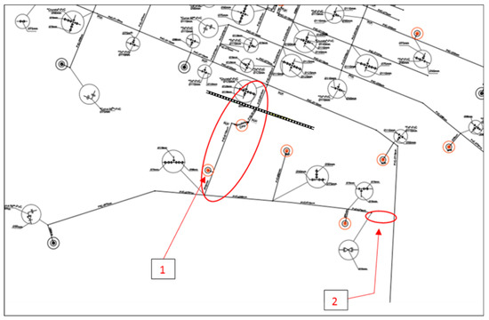 2008 design map of the water distribution network in Bairro Central. Red circle 1 shows the proposed pipeline under the railway. Red circle 2 shows the absence of the pipe connecting to Bairro Central (source: Collins Sistemas de Agua Lda.).