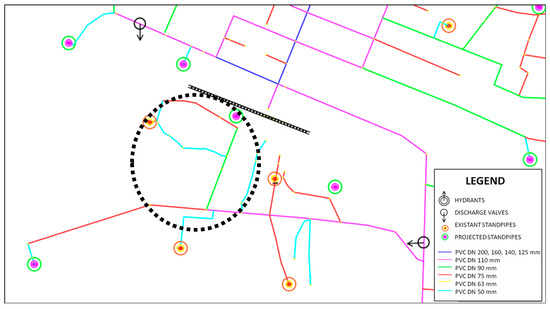 | Water distribution network composed by pipes with the following characteristics: PVC, PN9, D = 50 mm, 2480 m PVC, PN9, D = 75 mm, 4880 m PVC, PN9, D = 90 mm, 4520 m PVC, PN9, D = 110 mm, 2545 m PVC, PN9, D = 125 mm, PVC, PN9, D = 140 mm PVC, PN9, D = 200 mm |
