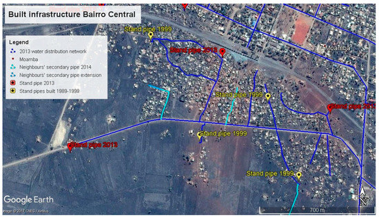 Moamba water supply is intermittent for different reasons. One is the frequent interruptions in the electricity needed for the pumps to abstract water from the river. Another reason is the recurrent droughts, which affect the water table of the Incomati River and reduce the capacity of the intake station to inject water into the water treatment and distribution system. Finally, another common cause for interruptions in the water supply service is frequent ruptures and leakages in the distribution network. These breakdowns force the operators to turn off the pumps and interrupt the service until they have fixed the problem. Based on the interviews conducted with managers and operators of the water utility, we identified Bairro Central (meaning central neighborhood) as one of the areas with major challenges in supplying water in Moamba. The interviewees stated that these difficulties have to do with the typography of the terrain and with the low pressure in the distribution network. Knowing the historical development of the water infrastructure in Moamba as a whole, we decided to zoom in on this particular neighborhood to further explore the emerging nature of the infrastructure in this problematic area, also looking at the outcomes.