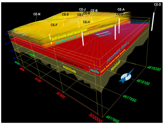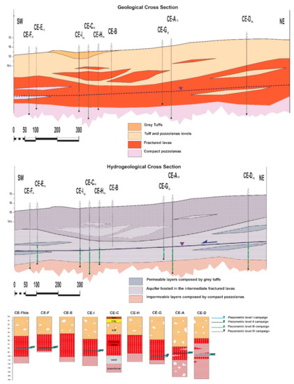 The reconstruction of a detailed geological cross section (Figure 2) allows us to identify the limit of the aquiclude represented by the “Pozzolane inferiori” formation. Using the surface geological and geometrical data acquired directly in the field and well log stratigraphy it was possible to correlate and model the complete volcanic sequences observed in the area investigated. Furthermore, each single geologic unit was geometrically identified and superimposed on the others to obtain a complete 3D picture of the whole volcanic template succession using the Voxler3 software. In fact, the overall volcanic sequence lies in an unconformity above a thick sedimentary succession mainly represented by clay, sand, and silt. Heterogeneity of the geological substrata is represented by the alternation between tuff levels and lava lenses in the upper half portion of the cross section (between 0 and 50 m), while the lower half one is characterized by thick fractured lava levels. The latter are characterized by constant thickness in the NE–SW direction and by important lateral thickness variations in the W–E direction. This aspect represents an important factor that strongly limits water circulation towards West and East.