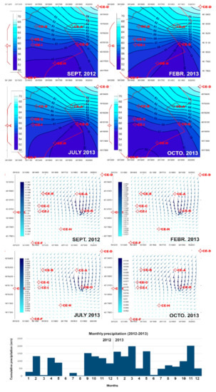 Reconstruction of the piezometric level variations (meters above sea level) in the different sampling campaigns: I September 2012; II February 2013; III July 2013; IV October 2013. Each red circle represents a piezometer sampled (CE-A, CE-B, CE-C, CE-D, CE-F, CE-G, CE-H, and CE-I). The blue arrows show the drainage direction and magnitude. The red line corresponds to the contour of the waste treatment plant. In the bottom part of the Figure, the monthly cumulative precipitation are reported.