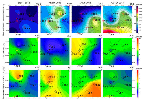However, by considering unconventional parameters such as DOC and cell viability and applying a geostatistical analysis we were able to identify some points where the groundwater was unexpectedly vulnerable to inputs from the surface. In this context, the high DOC value observed for the most vulnerable piezometer CE-B, whatever the season, can be ascribed to the dump’s presence. Using our approach, we identified the initial carbon input peak, at the CE-B piezometer, (September and February) and its transfer with the subsurface water flow in the following months toward the Southern sector of the area investigated though groundwater circulation. In fact, a progressive increase in DOC values during time at the CE-G (February and July), CE-H (February–July) and, downstream, CE-F piezometers (July and October) was observed (Figure 6).