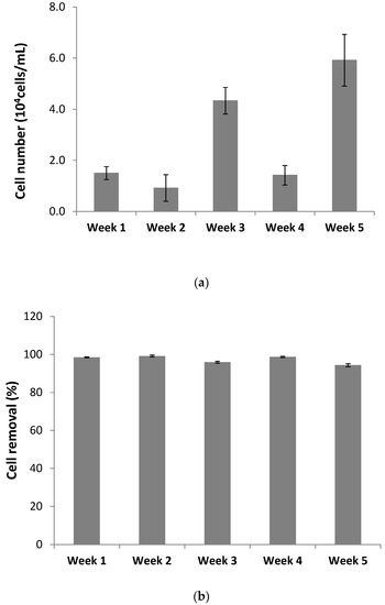 Quantification of Microcystis aeruginosa cells in the treated water (a) and percentage of removal of cells during constructed wetland (CW) treatment (b) (mean and standard deviation, n = 3). Lake water was spiked with 106 cells/mL of M. aeruginosa before introduction into CW microcosms.
