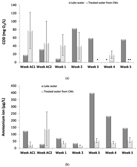 (a) Chemical oxygen demand (COD) concentrations and (b) ammonium ion concentrations in lake water and in CW-treated water along the sampled weeks. * Due to technical problems, the treated water of week 3 and lake water of week 4 could not be analysed for COD. ** The treated water from CW in week 5 had non-detectable levels of COD (<1 mg/L). Week AC1 and Week AC2 indicate the first two weeks of system acclimation.