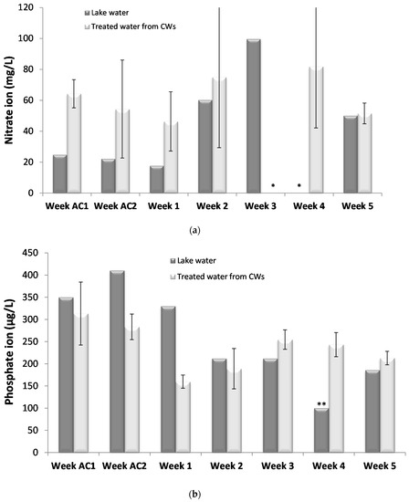 (a) Nitrate ion concentration and (b) phosphate ion concentration in lake water and in CW-treated water along the sampling weeks. * Due to technical problems, the treated water of week 3 and lake water of week 4 could not be analysed for nitrates. ** The lake water sample from week 4 had a phosphate value below the limit of detection (LOD) (<100 µg/L). Week AC1 and Week AC2 indicate the first two weeks of system acclimation.