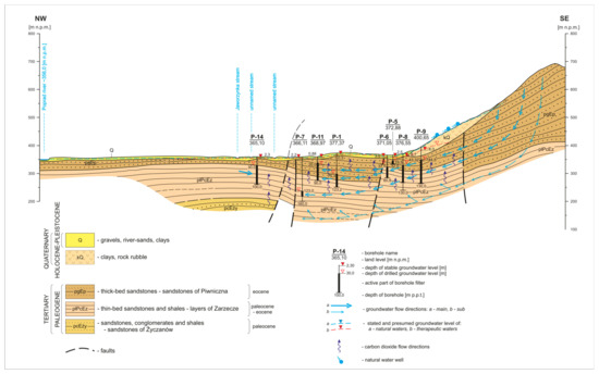 Hydrogeological cross-section with CO2 directions [29,30,31] modified (cross-section line is shown on Figure 2).