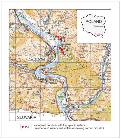Therapeutic water, according to the Polish Geological and Mining law [1], means groundwater that is not contaminated chemically or microbiologically and, additionally, has a natural variability of physical and chemical characteristics, with the contents of total dissolved solid mineral components (TDS)—not less than 1000 mg·dm−3—or unbound carbon dioxide—not less than 250 mg·dm−3—except that 250 to 1000 mg·dm−3 are “waters containing carbon dioxide” (“wody kwasowęglowe” in Polish), and above 1000 mg·dm−3 are “carbonated waters” (“szczawy” in Polish).