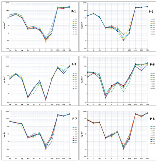In the case of studies of therapeutic waters, it is particularly important to analyze the components or parameters that determine their status as therapeutic waters according to the criteria of the Geological and Mining Law [1]. The analysis may be performed on the basis of trends in the parameters tested. The decreasing trend in the concentrations of specific components or TDS values may indicate the risk of losing the therapeutic nature of the abstracted waters, but only if the values of the determined components approach the legal limit [1]. In the case of the P-6, P-7, and P-8 abstractions, decreasing trends were observed (Table 2) but the safety buffer is high, and the results of the analyses indicate high concentrations/values of the analysed parameters. Therefore, despite these downward trends, there is no risk of losing the status of therapeutic water.