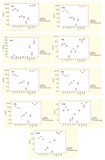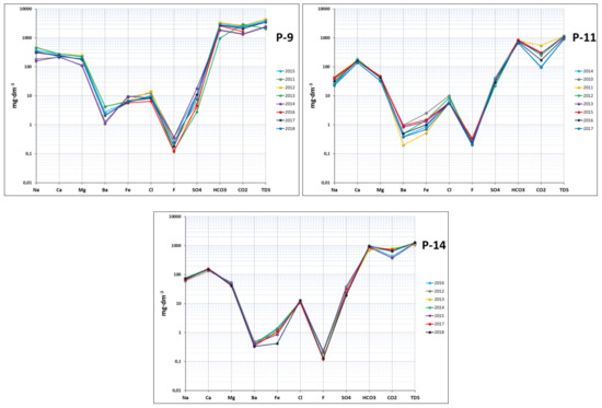 Table 1 presents hydrogeochemical types of waters abstracted in the analyzed wells according to their characteristics adopted in hydrogeological documentation determining their operational resources. During the operation, the natural variability of observed element concentrations is checked, and thus the hydrogeochemical type may undergo periodic changes. Based on the graphical analysis of the above charts, it may be seen that the concentration of the Ca, Mg, and Na cations shows the greatest variability for the P-6 and P-9 boreholes. As for the anions, as already stated, the bicarbonate ion is always clearly dominant, with the chloride ion being observed in the second place (the P-1, P-7, P-8, and usually P-2 and P-9 boreholes), or sulphate (the P-5, P-6, P-11, and P-14 boreholes).