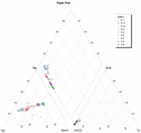 The Schoeller–Berkaloff diagrams (Figure 4) highlight similar tendency between the main ions in the analyzed groundwater samples, in particular HCO3 ion is always dominated. Ca, Mg, and Na ions are always the main group among the cations and reach the highest concentrations. Most often, Ca ion dominates, except for the P-7, P-8, and P-9 boreholes, where sodium is the dominant cation by weight.