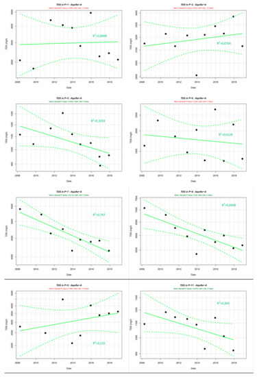 Analyzing the results in relation to the TDS value in water from the P-1, P-2, P-6, and P-9 wells during the analyszd years, no significant trend in this respect was observed (Figure 7), which means that the condition of the observed mineralization of abstracted water is at a stable level. Therefore, the exploitation does not cause any changes in this respect.