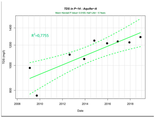 On the basis of the TDS value base in the abstracted waters, charts showing its variability in individual abstractions were made (Figure 6) using the GWSDAT program and the R program.