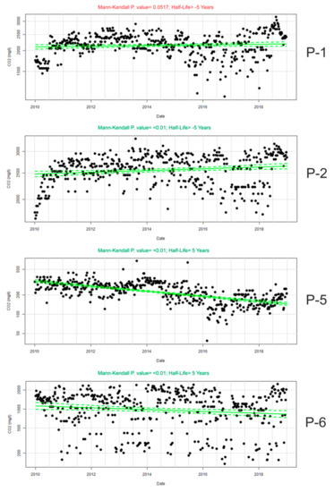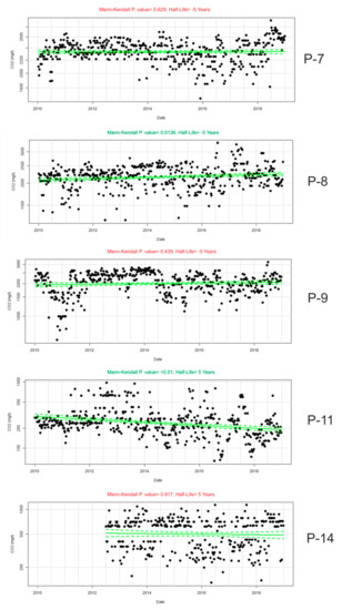 For the remaining abstractions, the statistically significant trends were identified, with the P-2 and P-8 boreholes moderately increasing, and for the P-5, P-6, and P-11 boreholes, this is a relatively small downward trend. The decrease in CO2 content may result in the loss of therapeutic water status based on this criterion, while the trends observed do not indicate either rapid or pronounced changes, but rather a slight decrease in the carbon dioxide content. Due to the widespread mosaic geological structure and complicated CO2 circulation paths [15,19,26], confirming a constant trend requires further stationary observations.
