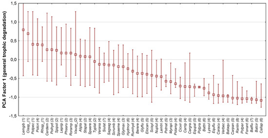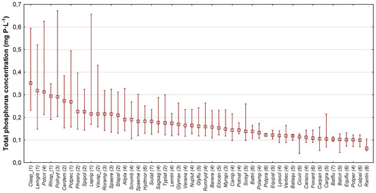 Preferences of macrophyte species in relation to total phosphorus concentration (Figure 2) and PCA Factor 1 (Figure 3) are presented graphically. The diagram includes 51 macrophyte taxa found during the study at at least four sites, which are ranked according to decreasing median values of total phosphorus concentration and PCA Factor 1, respectively. High values of total phosphorus concentration and PCA Factor 1, related to the general trophic degradation, corresponded mainly to taxa, which in the MIR index were ascribed indicator value l = 1 or 2 (taxa in the left-hand part of Figure 2 and Figure 3), for example Ceratophyllum demersum, Cladophora sp., Lemna gibba, Leptodictyum riparium, Potamogeton pectinatus, Rhizomnim sp., and Spirodela polyrhiza, Vaucheria sp. The median of the total phosphorus concentration for this group of taxa lay in the range 0.21–0.36 mg P·L−1, with maximum values exceeding 0.65 mg P·L−1. On the other hand, low values of total phosphorus concentration and PCA Factor 1 usually corresponded to taxa ascribed indicator values l ≥ 5 (taxa in the right-hand corner of Figure 2 and Figure 3), for example Batrachium aquatile, B. circinatum, B. fluitans, Caltha palustris, Carex gracilis, C. paniculata, Cicuta virosa, Equisetum fluviatile, Fontinalis antipyretica, and Ranunculus lingua. The median total phosphorus concentration for this group of taxa was within the range 0.07–0.12 mg P·L−1.