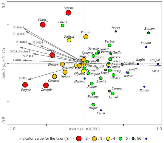 The relationship between aquatic plant species and environmental variables was demonstrated by CCA analysis and presented graphically (Figure 4). The first axis accounted for 37.8% (ʎ1 = 0.290) and the second axis for 14.6% (ʎ2 = 0.112) of the total variance in the relationships between the aquatic plant taxa and environmental variables. The interpretation of the first axis appears to be relatively simple. It is strongly correlated negatively with nutrients (especially forms of phosphorus) and positively with the MIR index, and can be explained as the general trophic degradation. High concentrations of nutrients in the water favor mainly macrophyte taxa with low indicator value (l ≤ 2), e.g., Ceratophyllum demersum, Cladophora sp., Lemna gibba, Leptodictyum riparium, Phalaris arundinaceae, Potamogeton pectinatus, Rhizoclonium sp., and Spirodela polyrhiza (left part of Figure 4). On the other hand, low biogen concentrations favor macrophytes with high indicator value (l ≥ 5), e.g., Batrachium aquatile, B. circinatum, B. fluviatile, Caltha palustris, Equisetum fluviatile, Fontinalis antipyretica, and Ranunculus lingua (right part of Figure 4). It appears that the indicator value of some species should be adjusted in the future, e.g., Hydrocharis morsus-ranae and Potamogeton crispus should have their indicator value lowered. Table 7 presents the correlation among environmental factors in the ordination analysis for frequency and cover data. The Monte Carlo permutation test showed that only 5 of the 10 variables presented significant lambda-1 values (ʎ1 > 0.20; p < 0.05), while for conditional variance (ʎA > 0.05; p < 0.05) only six variables presented significant values.