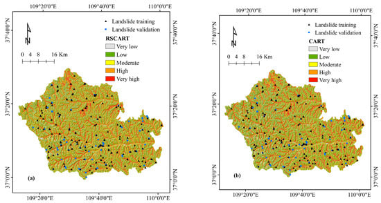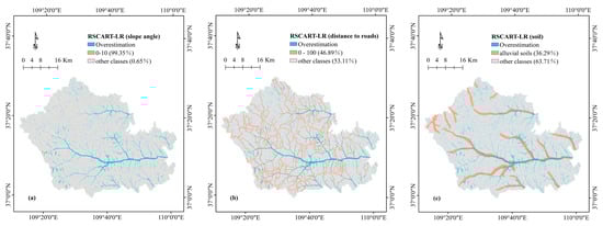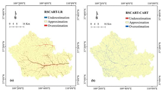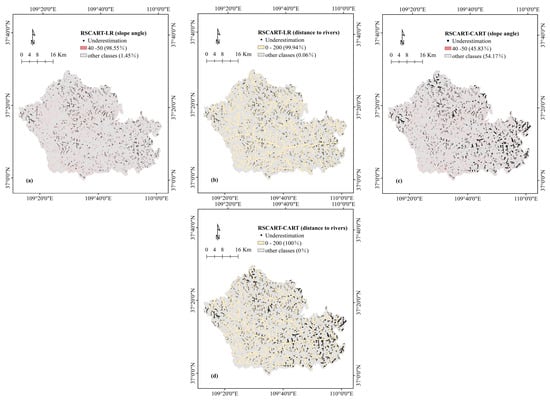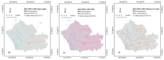 | Underestimation | RSCART-LR | slope, 40–50; STI, 10–20; TWI,1.11–2; SPI, 30–40; distance to rivers, 0–200; distance to roads, >400 |