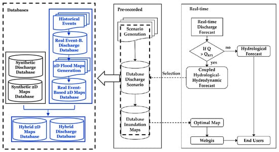 A different approach, with a fine resolution and a wide range of discharge forecast, is presented by Bhola et al. (2018). The method is based on an offline database of high flow runoff curves and corresponding 2D inundation maps previously simulated with a fine spatial and temporal resolution. The offline flood maps are selected based on the forecasted discharge hydrographs in the gauges located upstream of the study area and the available simulations stored in the offline database. The term “offline” refers to maps retrieved from a pre-recorded database, as opposed to online which refers to maps produced at real-time [5]. In this paper, we focus on improving the runoff database by including scaled historical flow data series in order to provide a more robust hybrid database.