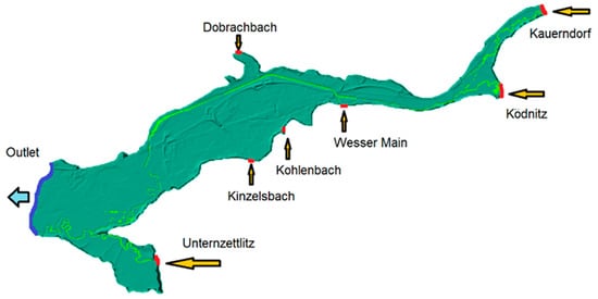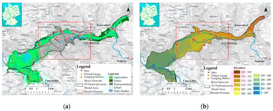 The site of the study was the area around the city of Kulmbach, in northern Bayern. The area has approximately 12 km2 and contains the city center (Figure 2). The water bodies (channel and lakes) account for 7%, the urban area covers 26%, including industrial and residential buildings and transport infrastructures as roads and railway tracks; forests account for 5% of the total area [5]. The area is elongated and narrow in the north-eastern part, with a fluvial valley surrounded by hills. In the eastern part, it widens as the valley enters a flood plain area. The town of Kulmbach is situated in the center of the area. The maximum elevation is located in the higher north-eastern part with 325 m, while the minimum is located in the lower south-eastern one with 290 m. The three main rivers entering the area are the Schorgast and the Weisser Main from north-east and the Rorter Main from the south-west. The discharge of the rivers is recorded at the gauge stations of Kauerndorf, Ködntiz, and Unternzettlitz respectively. Other minor streams are entering the area from the north (Dodrachbach) and south (Kinzelsbach, Kohlenbach), but their discharges can be neglected in comparison with the three main rivers. The outlet of the area is situated in the western part.