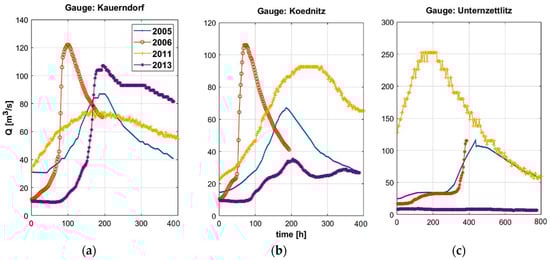 The four runoff events, February 2005, May 2006, January 2011, May 2013, selected for the validation plotted for the three gauges of (a) Kauerndorf, (b) Ködntiz and (c) Unternzettlitz.