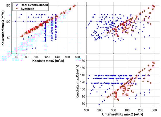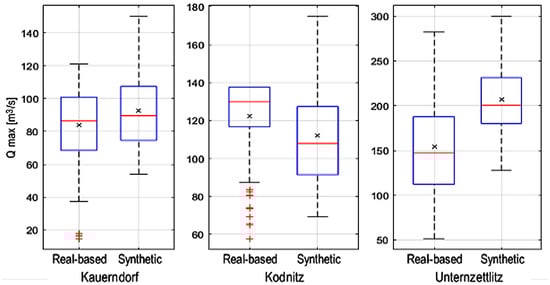 The historical runoff events extraction is carried out on the full discharge series from 1970 to 2017 for the three gauges of Kauerndorf, Ködntiz, and Unternzettlitz, obtained from the Gewässerkundlicher Dienst Bayern website (gkd.bayern.de) [27]. Once all 2D hydrodynamic simulations are complete, and their online flood maps are produced, the runoff series are used to test both the synthetic and real-based runoff databases and the respective offline flood maps. The comparison between the online maps of the validation events and the forecasted offline maps are used to assess the quality of the forecast and thus the performance of the databases SD, REBD, and HD.