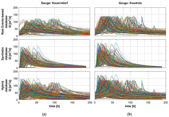 The advantage of the synthetic database is that it can be easily created using only values of return periods and durations for scaling an initial Gaussian shape. Hence, its creation is easier than building an historical database from the runoff time-series. The drawback is that this database could miss some characteristics of the natural runoff of the streams in the area. The synthetic events database is the same as in Bhola et al. (2018). It is built on a time-series of synthetic discharge shapes with different peak intensities and gradients. The synthetic events are based on the information on the probability of rainfall available from the Atlas distributed by the German Meteorological Services Deutscher Wetterdienst (DWD) KOSTRA (Koordinierte Starkniederschlags Regionalisierungs Auswertungen) [5,22]. The water balance model LARSIM (Large Area Runoff Simulation Model) was used to generate the inflow boundary conditions for the hydrodynamic 2D model in HEC-RAS using the produced rainfalls series [22]. The database includes 180 runoff events.