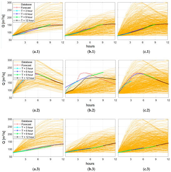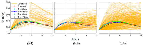 Comparison of runoff hydrographs at the virtual gauge for the event of May 2013 for SD (a), REBD (b), HD (c). The yellow lines represent the hydrographs of the offline database, the red line the runoff forecast, the light blue, blue, green, and black lines represent the selected offline hydrograph for the intervals of 3, 6, 9, and 12 h, respectively.