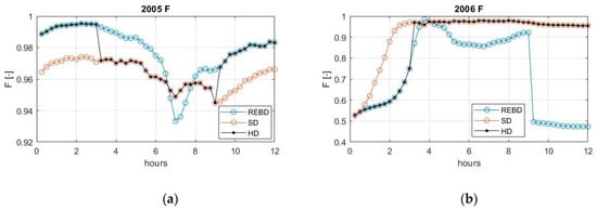 Overall, even though the best results are not always achieved by HD, the hybrid database guarantees more stability for the forecasts, meaning that the values of e and F outperform at least the worst of the two individual databases. The two smaller databases SD and REBD alone are more likely to encounter an event with characteristics one or the other cannot fit.