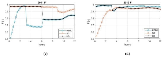 Fit Statistic values every 15 min for the online and offline maps related to the four validation events of 2005 (a), 2006 (b), 2011 (c), and 2013 (d) using the REBD, SD, and HD.