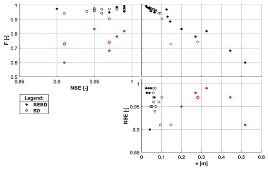 Scatter plot of the good fit criteria for the runoff series NSE and the comparison criteria for the online and offline flood maps Fit Statistic F and average absolute error in water depth e. The exceptions with high NSE values but poor F and e performances are marked in red.
