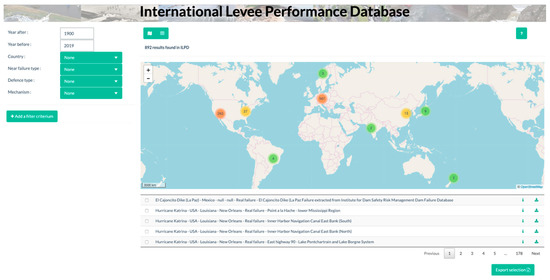 A screenshot of the opening page of the website is provided in Figure 1. The interactive map allows for navigation to all available failure cases. Each marker on the map represents the location of a failure case. Underneath, the cases pictured on the map are listed. When the case of interest is selected, basic information of the failure is presented and the media (if present) can be viewed. After selecting one or more cases, a click on the button ‘Export selection’ gives a pop-up window in which the type of data to be downloaded can be chosen. On the left side of the map, several filter criteria can be set. The database can be filtered based on time span, country, case study type, defence type or failure mechanism. Moreover, more filter criteria are available using the ‘Add filter criterion’ feature and a combination of different filter criteria can be made as well.