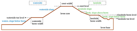 Given that various terminologies exist for levee failure mechanisms and other related parameters, a challenge in setting up an international database is to establish a list of uniform, globally acknowledged definitions. Flood defences are hydraulic structures whose primary objective is to provide flood protection along the coasts, rivers, lakes and other waterways [30]. A levee (also referred to dike or embankment) is a water retaining structure consisting of soil (fully or partly) with a sufficient elevation and strength to be able to retain the water under extreme circumstances [31]. A typical levee cross section is given in Figure 2. Earthen levees, which form a large part of the existing flood defence systems, can be constructed with (a) homogeneous soil (homogeneous earthfill), (b) several soil types (layered structure) or (c) a hard structure (levee structure combination), such as a levee with a floodwall. Examples of other types of flood defence systems are dams, dunes, storm surge barriers or temporary flood defences.