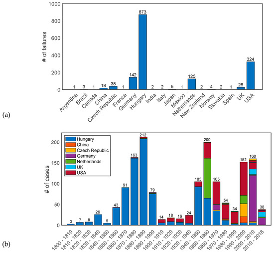 A large number of failure cases are collected all around the world and their basic statistics are reported in this section to provide an overview of the characteristics of the database. Currently (October 2019), the ILPD includes 1572 failure cases of which 1538 are the failures of flood defences occurred in different time periods and 34 of them are full- and small-scale experiments collected from different countries (Figure 4a). The available information mainly concerns the failures of levees (1418 cases) and levee structure combinations (14 cases) occurred along rivers (89%), coasts (10%) and canals (1%) but also of some earthen dams (106 cases) due to their similar composition to levees. The majority of the levee failures before 1900s mostly occurred in the Carpathian Basin in Hungary, as reported by [25,37] but these only contain generic information. The other cases reported in the ILPD, occurred in the last 100 years, are mostly from Germany, The Netherlands, USA, UK and Czech Republic (Figure 4b). It is noted (and further discussed in Section 4) that the geographical and temporal distributions shown in Figure 4 only represent the data currently included in the database.