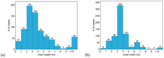 Most failure entries in the database contain general information (Level.1: 1498 cases), such as levee and breach characteristics. As an example, Figure 5 shows that the crest height of the failed levees, which is defined as the differences between the toe level and the crest level, varies mostly between 1–5 m, whereas the crest width is in the range of 2–5 m. The database also includes more detailed information on the Level.2 (59 cases) and the Level.3 (14 cases) data.
