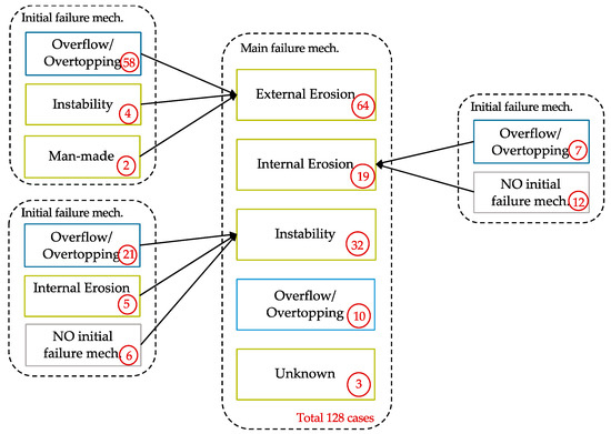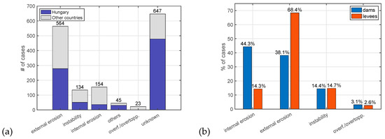 Analysis of the identified failure mechanisms within the collected cases in the database (Figure 6a) shows that more than half of the failures, of which their causes are known, occurred due to external erosion (61.5%), internal erosion (16.8%), instability (14.2%), overflow/overtopping (2.5%). Besides, the rest of the failures were due to other causes (4.7%), including man-made failures. It is noted that excluding the Hungary dataset [25], which forms the majority of the database, does not significantly affect this distribution (Figure 6a).
