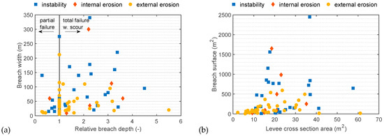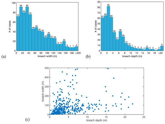 Levee breaching was observed for most of the failure cases that are entered in ILPD. Failures that did not lead to a breach at the later stage were mostly due to overflow/overtopping (23 cases). Information on the breach characteristics, given in Figure 7, shows that there is a considerable variation in breach depth and width values. Previous studies on breach models reveal that, under certain conditions, breach depth and width are correlated during some of the breach development stages [26,38]. However, breaching is a complex process that depends on many different factors (e.g., structure type, loading conditions, soil characteristics, etc.), thus the relation between breach depth and width may not always be explained by a simple relation model (Figure 7c).