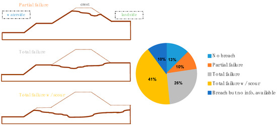 After these events, data was collected on levee failure cases, including location, geometry, levee structure, subsoil structure, vegetation, breach geometry and failure time. According to post-investigations [23,47], different degrees of damage have been observed on the levees. Based on the change in levee cross section, the breaches occurred in 2002 and 2013 are classified into three groups (Figure 9) as (a) partial failure (10%), where the breach depth was less than the crest height; (b) total failure (26%), when the crest was completely washed away; and (c) total failure with scour (41%), when, in addition to the crest, the soil beneath the toe level was also eroded. In most of the cases, the causes of levee failures were attributed to a combination of loads and local conditions (e.g., old breaches, tree roots, poor maintenance) [23].