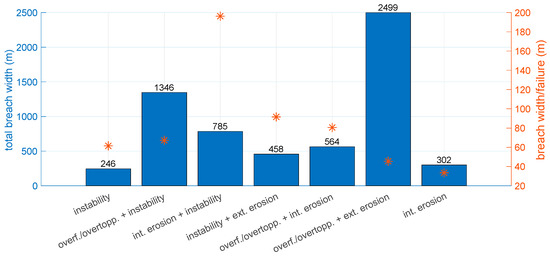 Although various breach prediction models have been developed empirically [48,49,50] and physically [51,52,53], there is still limited insight in the characteristics of breaches during real events. In this section, it is demonstrated for the Elbe case how information from the ILPD can be used to analyse breach dimensions, including the relationship with the failure mechanisms. Another important knowledge gap concerns the number of breaches and their width (i.e., breach density) which can be expected during flood events.