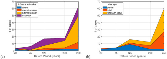 For the same events investigated above, we also explore the occurrences of different failure mechanisms and the degree of damage for different return periods (Figure 15a). In general, the total number of failures increases with the change in the return period. However, as it is given the Figure, external erosion is more likely to occur for high return periods. This can be explained by the fact that a high return period is related to high water levels and river discharges, which in turn leads to overtopping/overflow followed by an external erosion. Moreover, it is shown in Figure 15b that higher return periods lead to larger degrees of damage on the levees.