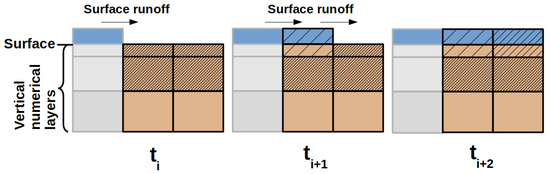 Surface/subsurface coupling for the transport module in CATHY is based on advective exchange [39], which does not account for all exchange processes, in particular solute remobilisation from soil to surface runoff. A conceptual mixing module is thus implemented to handle such processes, which arise either from diffusive transport between the surface and subsurface or from solute adsorption/desorption at the soil surface [47,48]. Indeed it is not possible to simulate surface adsorption in CATHY as the variable that carries solute information is a concentration, therefore solute presence is only acceptable when the soil surface is ponded. At the end of each time step, therefore, for each node under ponding, the solute concentration at the interface is set equal between the surface water and the first computational layer (see Figure 1). The mixing subroutine thereby produces a source or sink term for surface transport, and the subsurface concentration is updated, ensuring mass conservation.