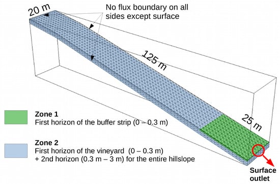 Based on the hillslope data, the soil characteristics are simplified for the CATHY model into two zones of contrasting properties (see Figure 2): the first horizon of the vegetative filter strip (designated as Zone 1), and the rest of the domain (designated as Zone 2). The domain is discretized into a surface mesh of 2 m × 2 m cells and a uniform depth of 3 m, subdivided into five layers of varying thickness (0.001 m, 0.249 m, 0.75 m, 1 m, and 1 m from top to bottom). The discretization yields a 3D mesh of 5016 nodes and 22,500 tetrahedral elements. A no-flux boundary condition is applied on all sides (including the bottom) except on the surface, which recieves rain. The outlet surface point is set downstream in the center of the hillslope width.