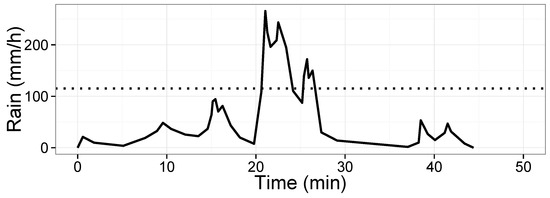 The 4 August 2004 event (Figure 3) was chosen for the simulations as it is representative of summer rain events in Beaujolais: A short and intense rain producing significant surface runoff. This particular event produced 31 mm of cumulative rainfall in 45 min. The temporal scale allows some process simplifications: Evapotranspiration is neglected, and the bedrock is considered impermeable.