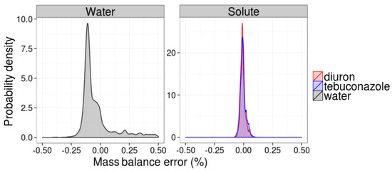 The effect of parameter uncertainty on output variables can be studied via the probability density functions of these variables, achieved by running CATHY on the Sobol sampling. The uncertainty analysis on the balance error shows that the probability density is not centered at zero for water and that the model tends to an artificial mass diminution (Figure 4). However, all results for water are very accurate and between −0.5% and 1.5% of error. For solutes, mass conservation is accurate as well and the error does not exceed 0.1% in most cases, centered at zero. There is no notable difference between diuron and tebuconazole on this output variable. Generally, the mass balance errors presented Figure 4 highlight the model robustness and the mass conservation in the coupling.