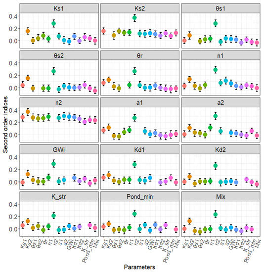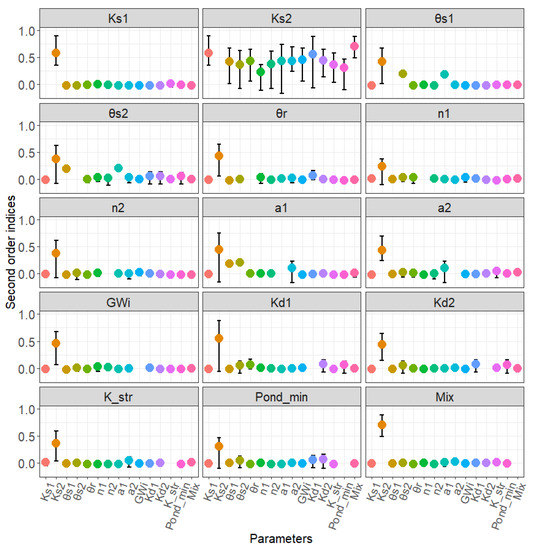 For each of the four output variables, the sum of first-order indices is between 0.55 and 0.65, showing that the model is not additive and confirming that interactions between parameters may explain a large part of the variance. However, this nonadditivity could also be due to other parameters that were not taken into account here. Globally, we note a reasonable uncertainty on the indices (less than 0.25) and a strong presence of interactions. The evolution in the vineyard subsurface volume between initial and final states in particular presents important and quite steady total indices for all parameters (except reaction parameters and minimum ponding height). For all these reasons, second-order indices are necessary to deepen the analysis of this output variable, and are presented next.