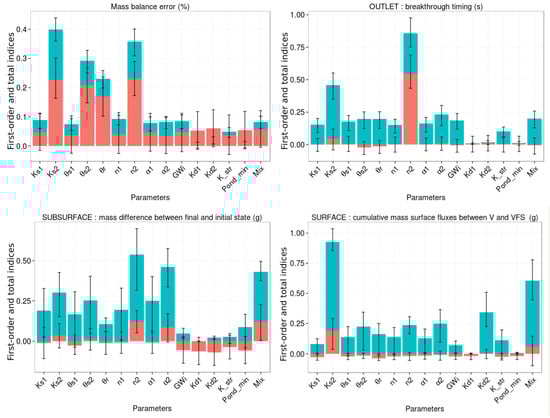 First-order indices (pink), total indices (blue), and 95% confidence intervals for tebuconazole transfer output variables: mass balance error, mass breakthrough time at the outlet, mass difference in VFS subsurface between initial and final state, and cumulative surface mass fluxes between the vineyard (V) and VFS. The suffix “1” refers to Zone 1 and the suffix “2” to Zone 2.