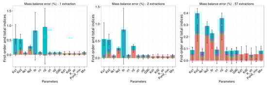 First-order indices have been computed with the two sampling methods from [51] (17,000 simulations per solute) and [52] (1922 simulations per solute). An additionnal sensitivity analysis is performed with the method from [51], but with a medium sample size (, namely 8500 simulations per solute). Figure 11 shows a comparison of obtained results for the cumulative volume exiting the outlet and the mass balance error for tebuconazole. For nonnegligible indices (i.e., superior to 0.05), the three analyses are consistent for the mass balance error; however the hierarchies of the most influential parameters are not identical. For the cumulative volume exiting the system, the index from the method of [51] with differs form the two others, and more generally on the two outputs, the index uncertainties are strong for this method, in particular compared to the same sampling method with . Concerning the low index value, the method of [51] with is not consistent with the other methods for cumulative volume at the outlet. For the evaluation of complex models, the determination of total indices and of their uncertainty allows quantitative highlighting of parameter interactions. However, the sampling methods associated with total indices entail high computational costs. As Figure 11 shows, the user cannot circumvent these costs by using a smaller N value without risking inaccurate results. Concerning first-order indices of the most influential parameters, the sampling method of [52] presents an undeniable advantage in terms of computation cost. However, its accuracy for less influential parameters vis-à-vis the sampling method from [51] is quite low.