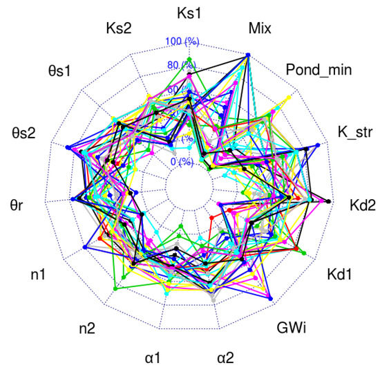 The second-order indices confirm the important effect of on the evolution in the vineyard subsurface volume, interacting clearly with all other parameters (see Figure 6). The sum of first-order and second-order indices for , namely 0.33 (Figure 5) and 0.4 (Figure 6), is near 0.79, which is the total index. This means that for this output variable, the parameter contributes mostly to direct effects and second-order interactions, and little to higher-order interactions. To a lesser extent, surface runoff parameters and interact, and and as well, potentially via surface/subsurface exchanges processes. Other parameters do not show significant interactions. Second-order indices on the other three hydrodynamical outputs confirm the clear trend of their first-order indices (Figure 5): major interactions of with other parameters for the cumulative volume exited, and of for breakthrough timing and cumulative surface runoff between V and VFS.