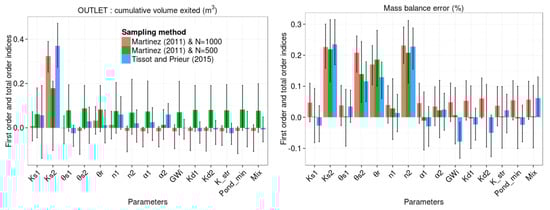 Comparison of first-order indices for cumulative volume exiting the outlet (m3) and mass balance error for tebuconazole (%) in the three methods: [51] with ,51] with , and [52].