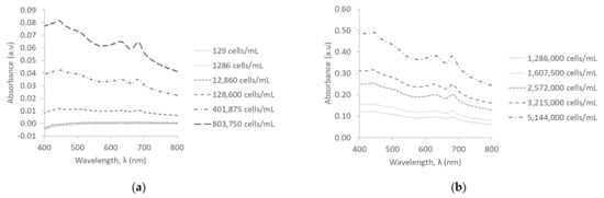 Initial experiments were carried out in contaminant free D.I. water. Absorbance spectra of M. aeruginosa CPCC 299 at three concentration ranges resulted in peaks at approximately 445 nm, 620 nm, and 682 nm, with the most obvious peaks at 682 nm. This peak (682 nm) is indicative of the presence of chlorophyll-a. Chlorophyll-a absorbs light at both 440 and 680 nm and phycocyanin absorbs light at 620 nm [15], which explains all the significant peaks observed for M. aeruginosa CPCC 299. The absorbance spectra for low (129–803,750 cells/mL) and medium (1,286,000–5,144,000 cells/mL) concentrations are illustrated in Figure 1a,b. The absorbance spectra for high concentrations are not shown, as the absorbance spectra at medium concentrations show that the method can easily detect these concentrations.