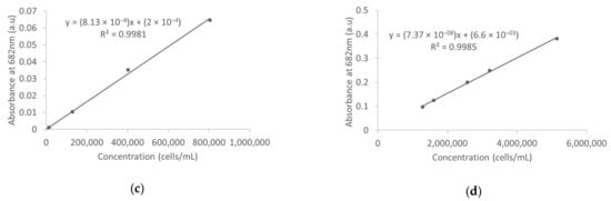 Similar to measurements in D.I. water, the absorbance spectra of all concentration ranges of M. aeruginosa CPCC 299 resulted in peaks at 445 nm, 620 nm, and 682 nm (Figure 4). The sharpest peaks were observed at 682 nm; however, peaks were not readily identified at concentrations < 401,875 cells/mL. The absorbance spectra of low and medium concentrations are illustrated in Figure 4a,b, respectively. Analysis at 682 nm revealed a linear trend and strong correlation between absorbance and concentration at all concentration ranges (R2 = 0.9994 at low concentrations; R2 = 0.9993 at medium concentrations; R2 = 0.9980 at high concentrations). The standard calibration curve of low and medium concentrations is illustrated in Figure 4c,d, respectively. The detection limit in surface water was poorer than in deionized water (i.e., 392,982 cells/mL in surface water compared to 338,950 cells/mL in D.I.), a response which was expected due to interferences from impurities.